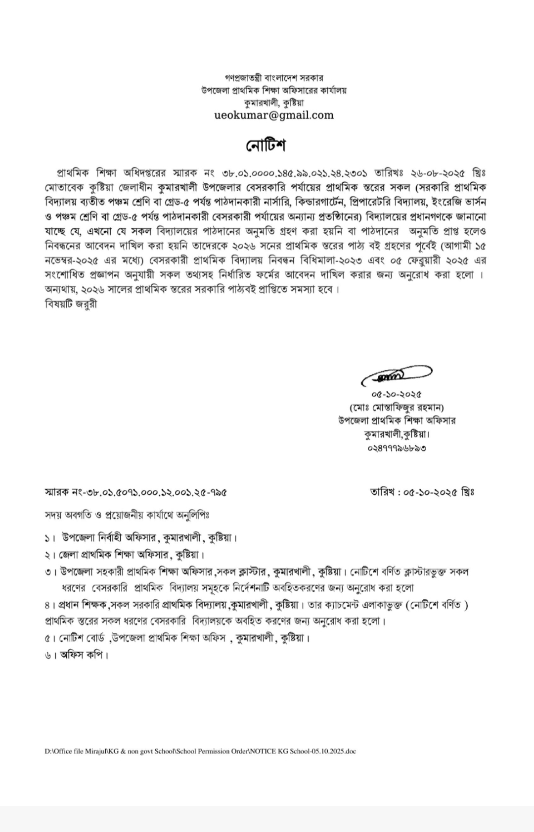 প্রাথমিক শিক্ষা অধিদপ্তরের স্মারক নং ৩৮.০১.০০০০.১৪৫.৯৯.০২১.২৪.২৩০১ তারিখঃ ২৬-০৮-২০২৫ খ্রিঃ মোতাবেক কুষ্টিয়া জেলাধীন কুমারখালী উপজেলার বেসরকারি পর্যায়ের প্রাথমিক স্তরের সকল (সরকারি প্রাথমিক বিদ্যালয় ব্যতীত পঞ্চম শ্রেণি বা গ্রেড-৫ পর্যন্ত পাঠদানকারী নার্সারি, কিন্ডারগার্টেন, প্রিপারেটরি বিদ্যালয়, ইংরেজি ভার্সন ও পঞ্চম শ্রেণি বা গ্রেড-৫ পর্যন্ত পাঠদানকারী বেসরকারী পর্যায়ের অন্যান্য প্রতষ্ঠিানের) বিদ্যালয়ের প্রধানগণকে জানানো যাচ্ছে যে, এখনো যে সকল বিদ্যালয়ের পাঠদানের অনুমতি গ্রহণ করা হয়নি বা পাঠদানের অনুমতি প্রাপ্ত হলেও নিবন্ধনের আবেদন দাখিল করা হয়নি তাদেরকে ২০২৬ সনের প্রাথমিক স্তরের পাঠ্য বই গ্রহণের পূর্বেই (আগামী ১৫ নভেম্বর-২০২৫ এর মধ্যে) বেসরকারী প্রাথমিক বিদ্যালয় নিবন্ধন বিধিমালা-২০২৩ এবং ০৫ ফেব্রুয়ারী ২০২৫ এর সংশোধিত প্রজ্ঞাপন অনুযায়ী সকল তথ্যসহ নির্ধারিত ফর্মের আবেদন দাখিল করার জন্য অনুরোধ করা হলো । অন্যথায়, ২০২৬ সালের প্রাথমিক স্তরের সরকারি পাঠ্যবই প্রাপ্তিতে সমস্যা হবে ।